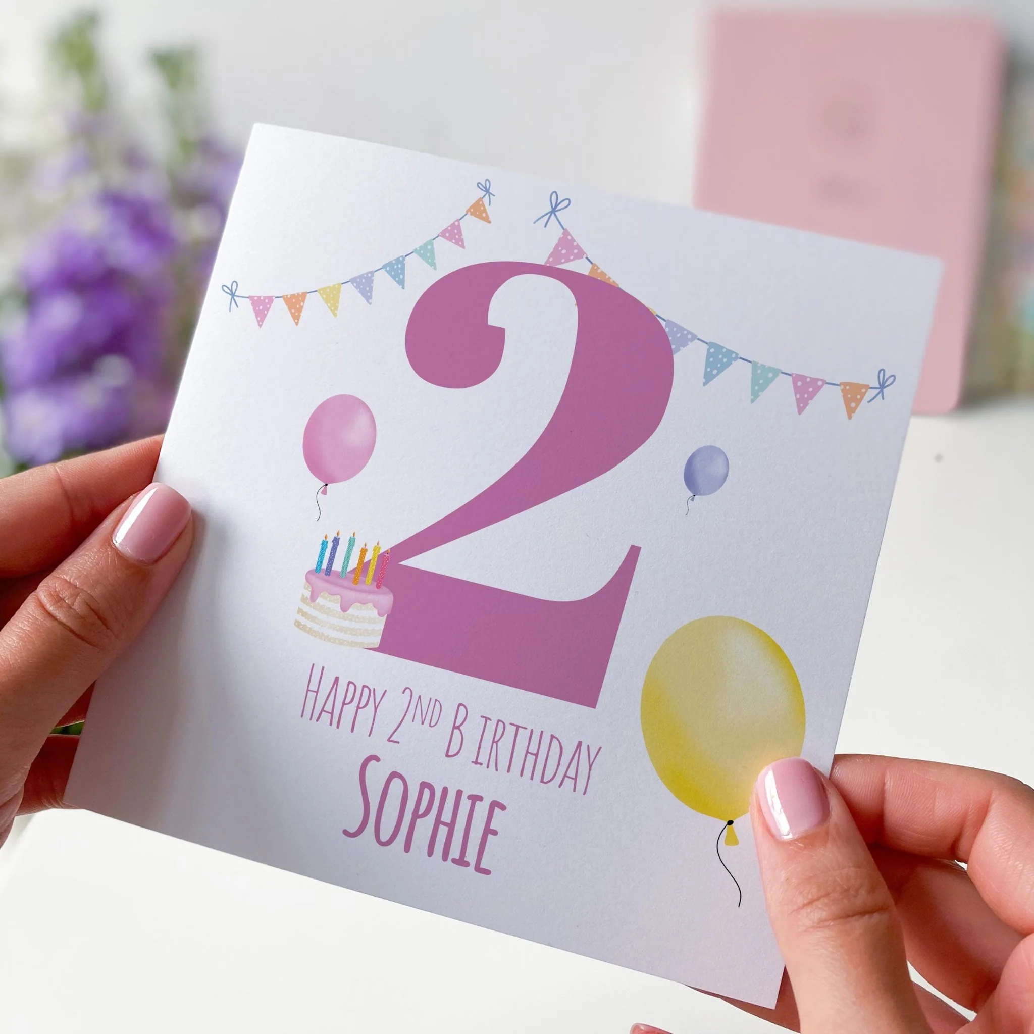 Bright birthday fun for her big seven. Balloons, cake, bunting. Add her name for a personalised keepsake she will want to save.