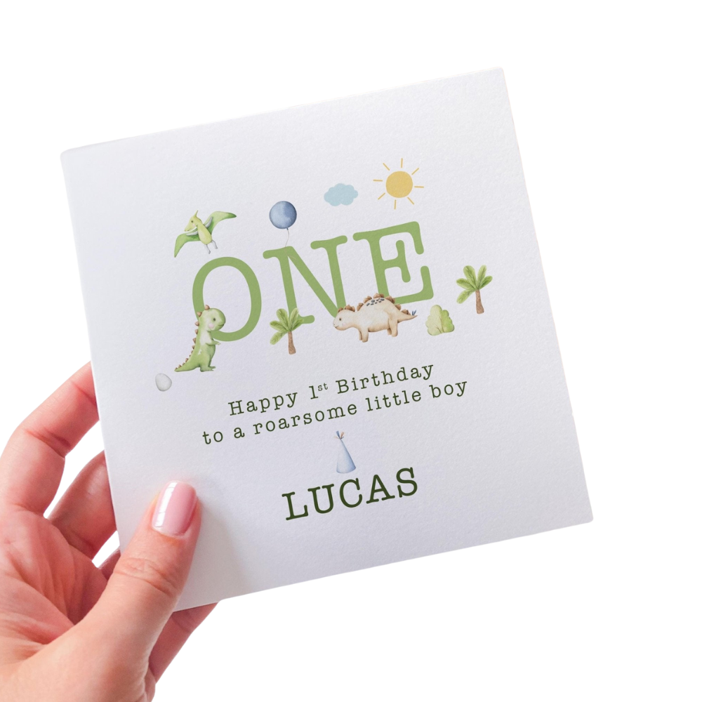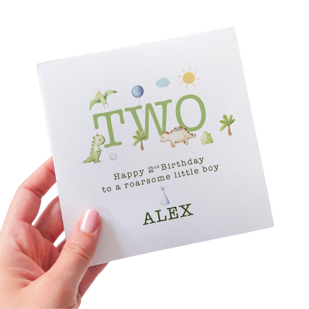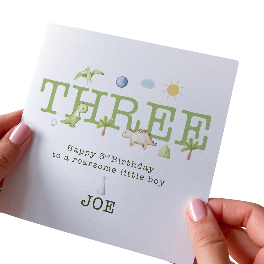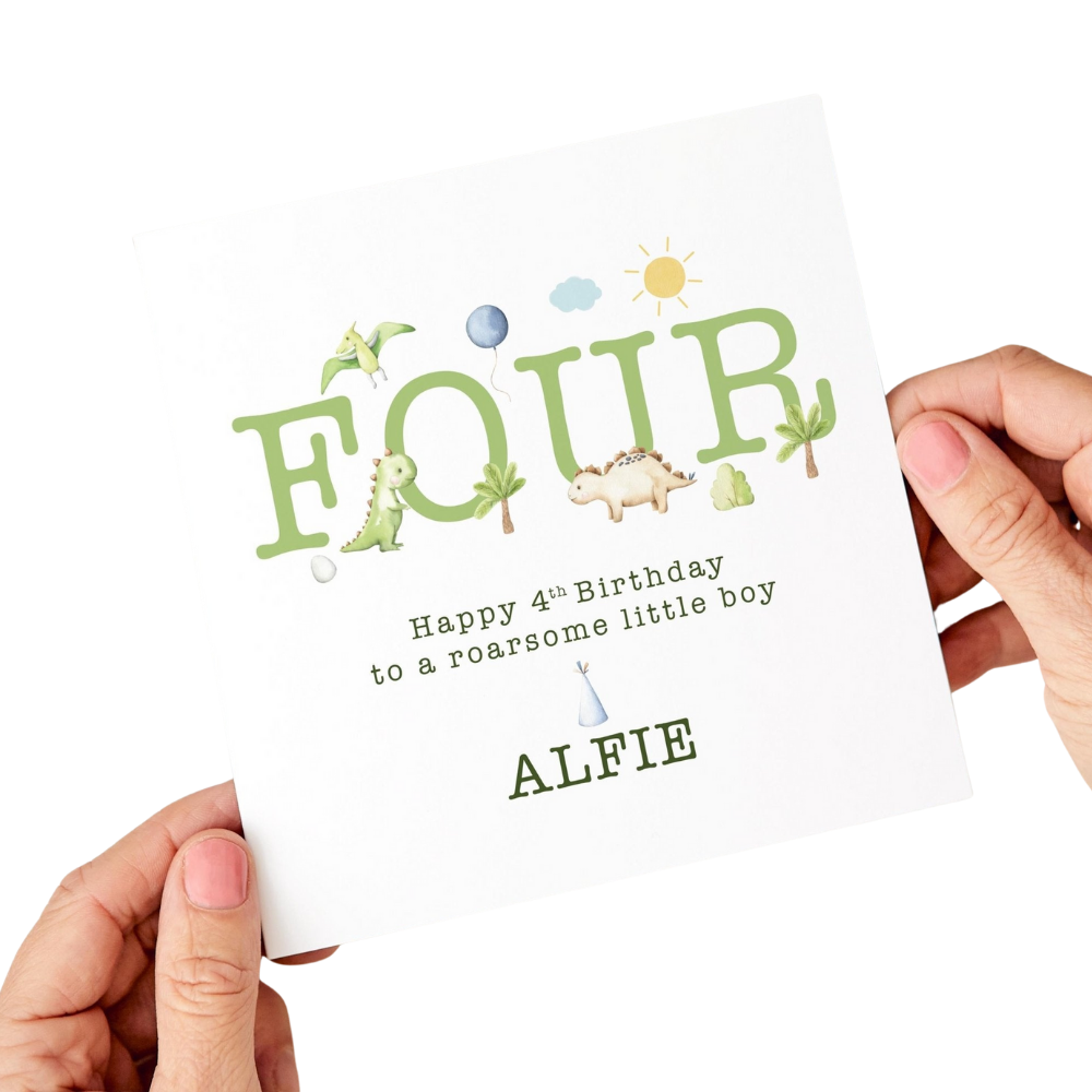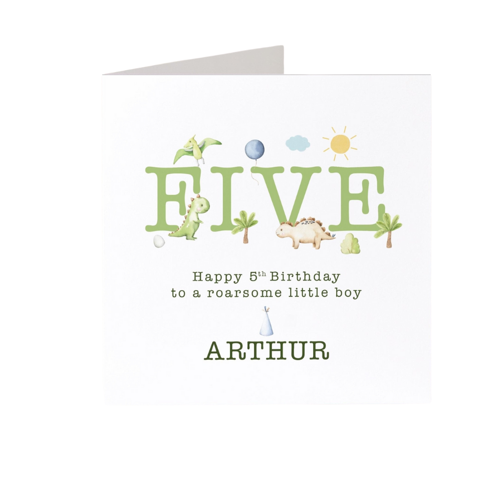 Make their birthday roar some. Personalised dinosaur card with name and age. Prehistoric party design for dino-loving boys.